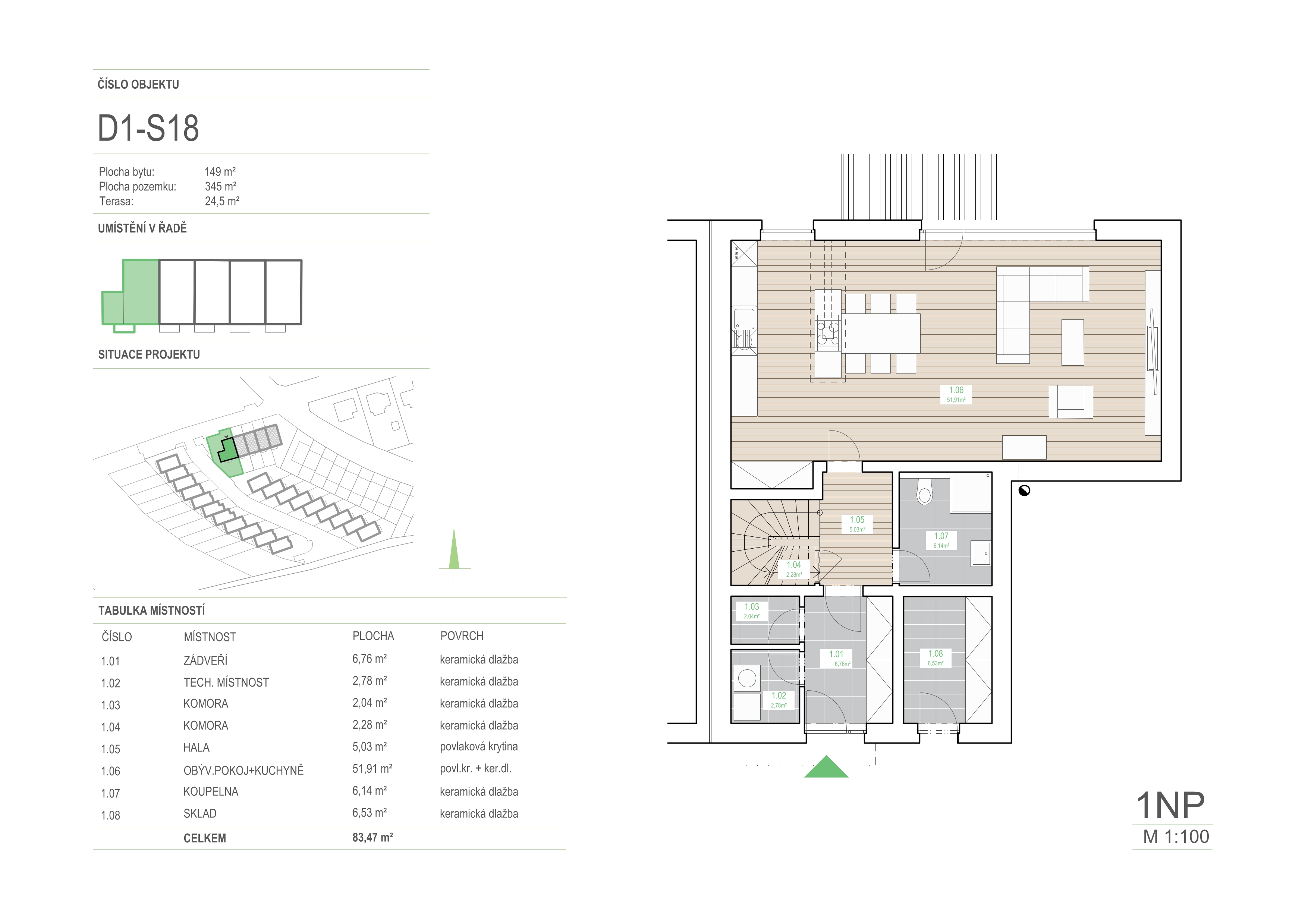 | 1.06 | obývací pokoj + kuchyně | 51,91 | povl. kr. + ker. dl. |