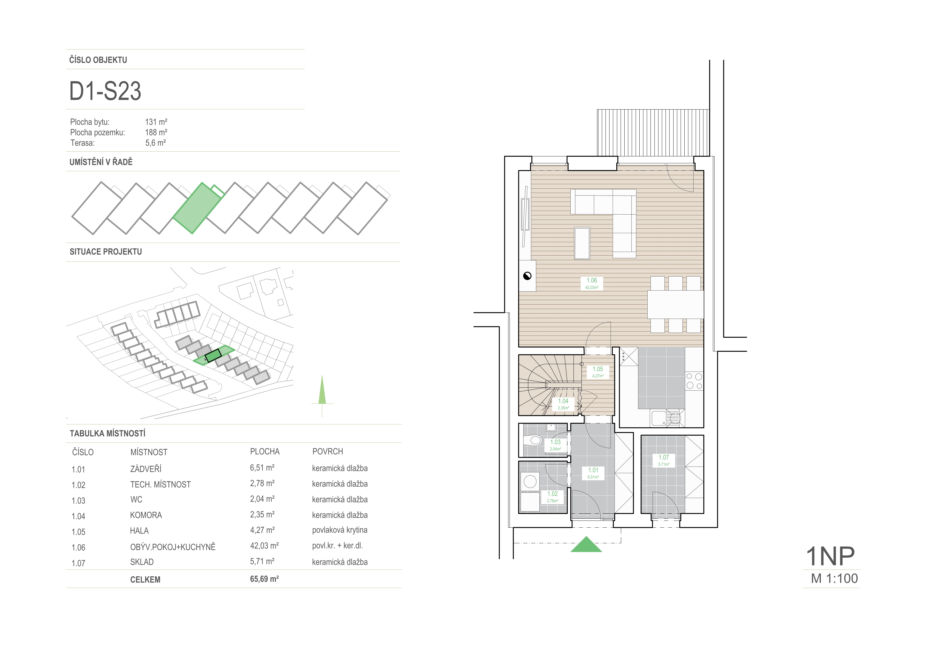 | 1.06 | obývací pokoj + kuchyně | 42,03 | povl. kr. + ker. dl. |