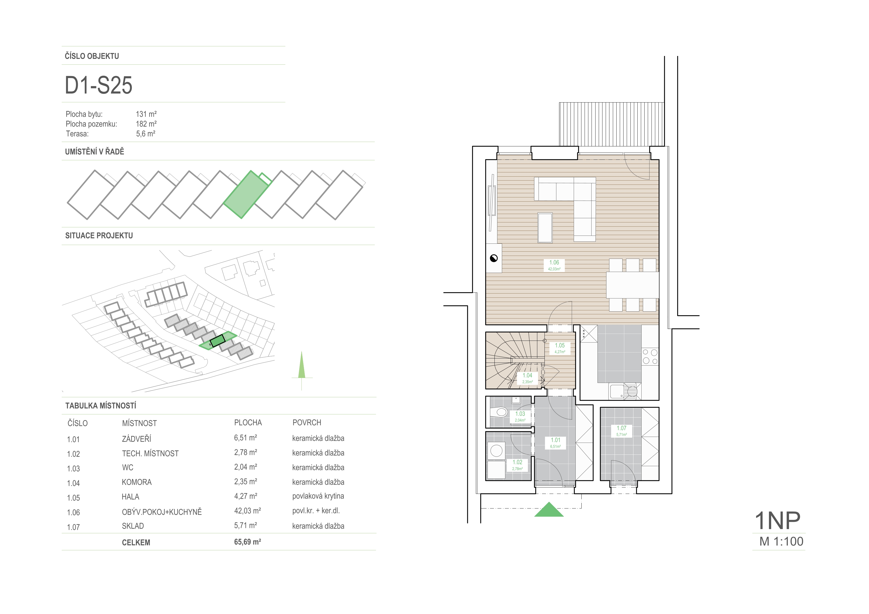 | 1.06 | obývací pokoj + kuchyně | 42,03 | povl. kr. + ker. dl. |