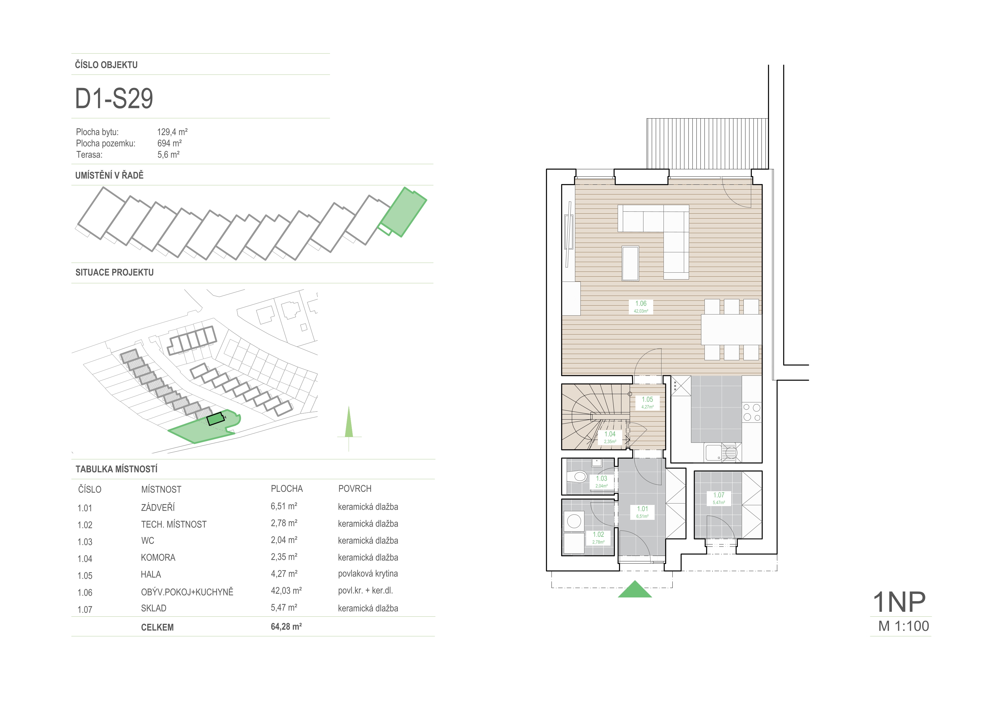 | 1.06 | obývací pokoj + kuchyně | 42,03 | povl. kr. + ker. dl. |