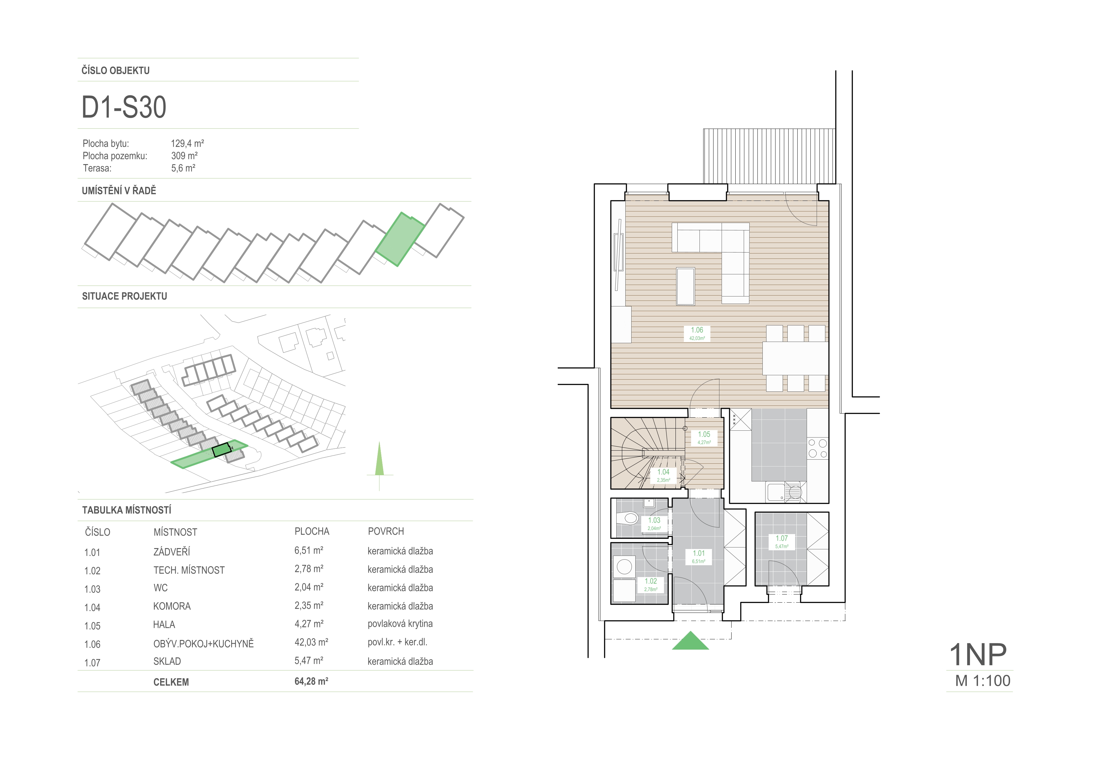 | 1.06 | obývací pokoj + kuchyně | 42,03 | povl. kr. + ker. dl. |