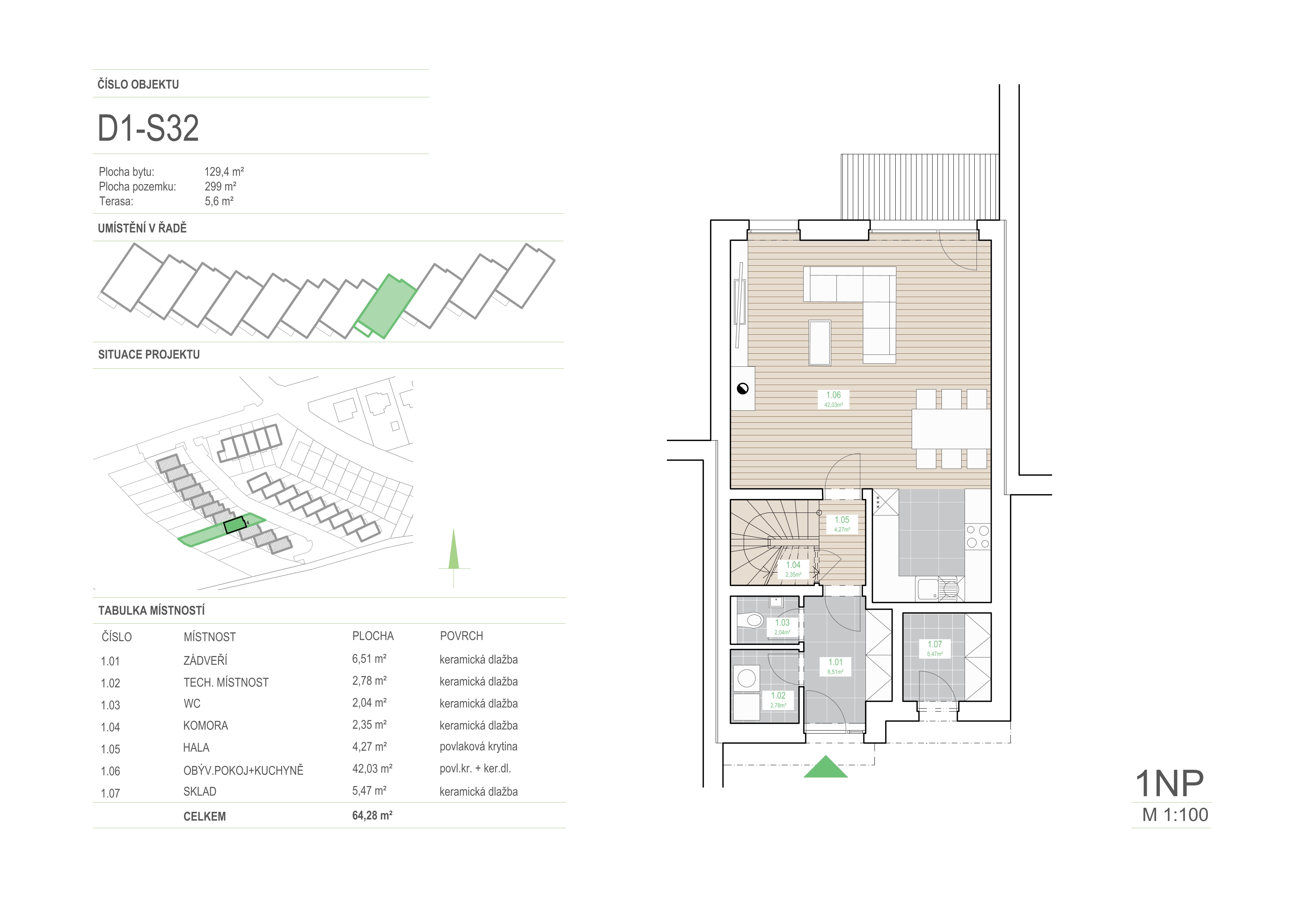 | 1.06 | obývací pokoj + kuchyně | 42,03 | povl. kr. + ker. dl. |