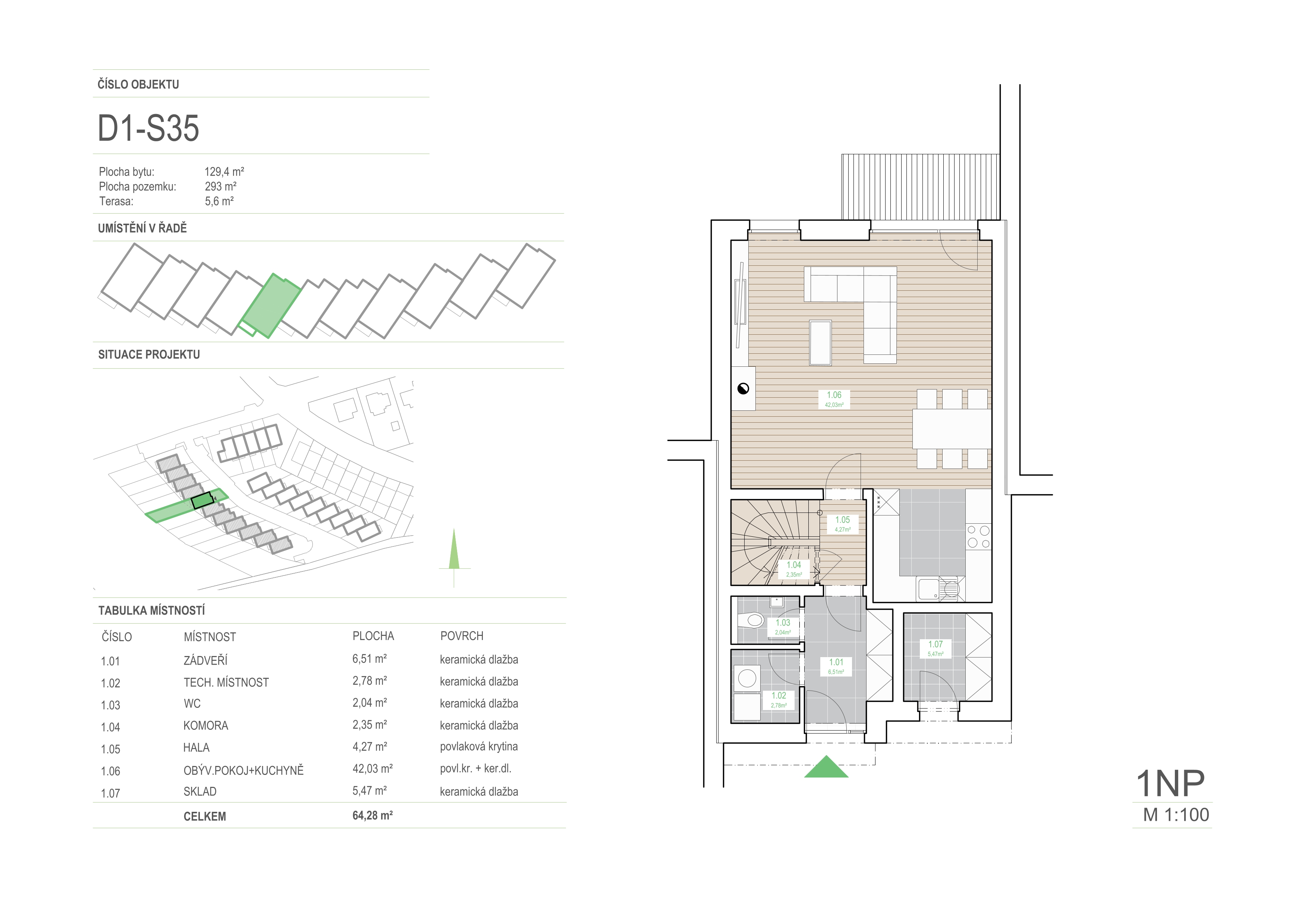 | 1.06 | obývací pokoj + kuchyně | 42,03 | povl. kr. + ker. dl. |