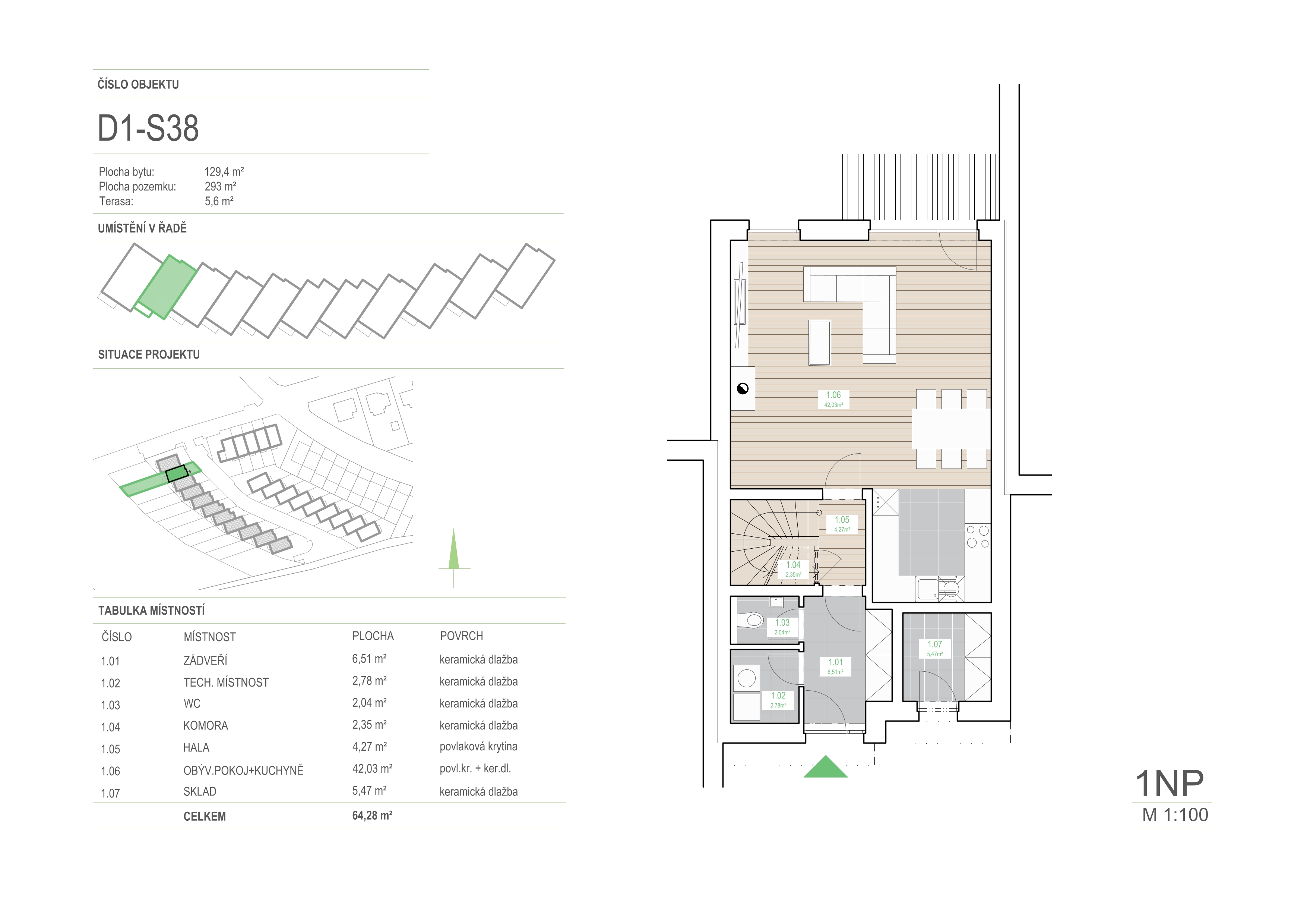 | 1.06 | obývací pokoj + kuchyně | 42,03 | povl. kr. + ker. dl. |