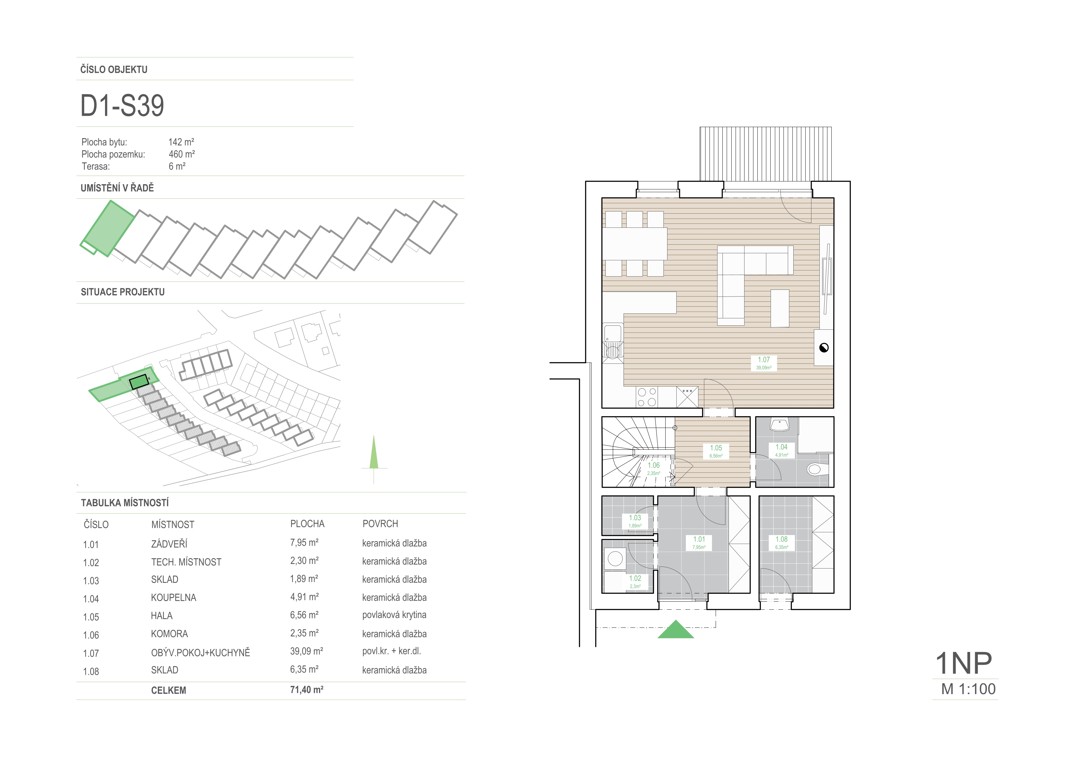 | 1.07 | obývací pokoj + kuchyně | 39,09 | povl. kr. + ker. dl. |